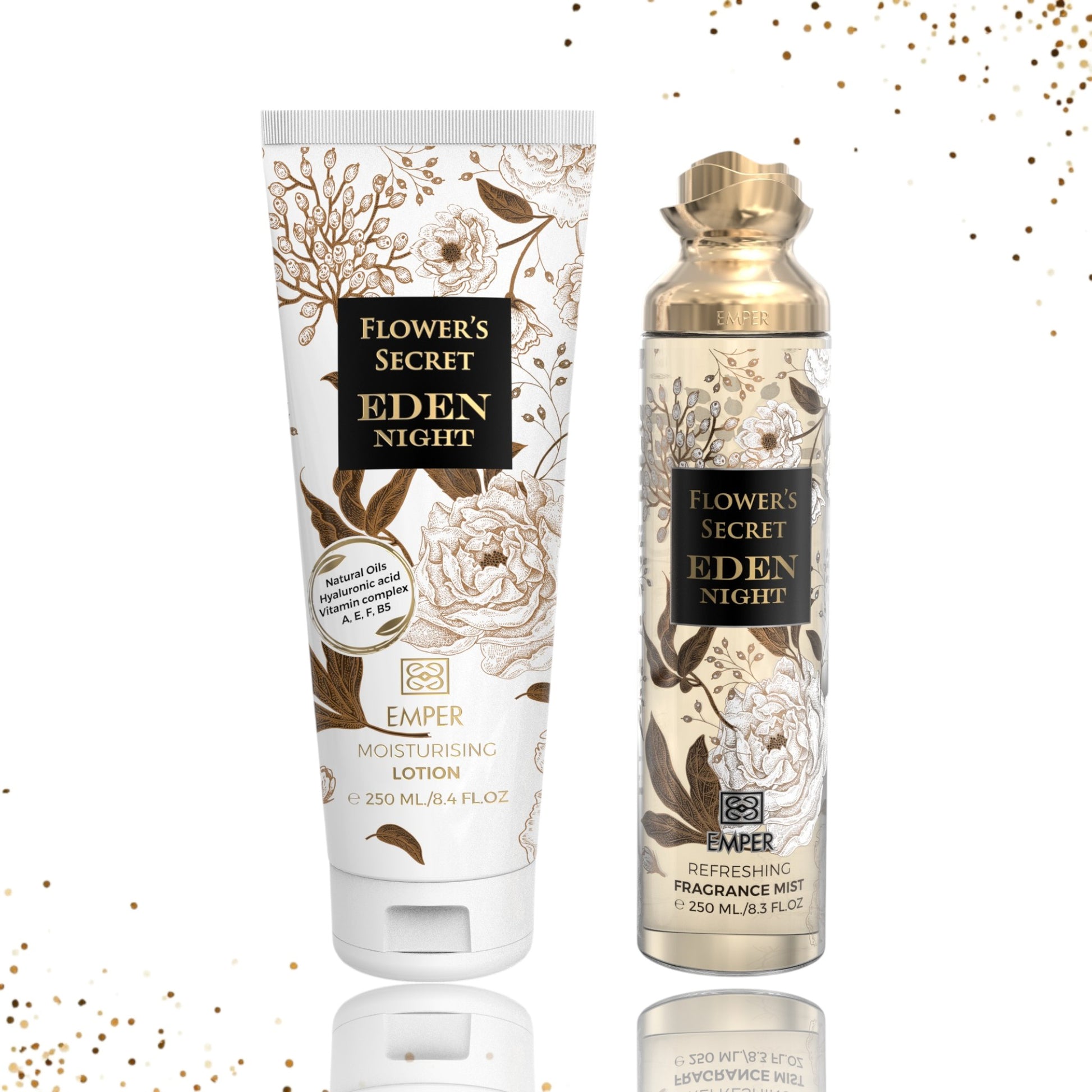 Indulge in the luxurious allure of Flower's Secret Eden Night Set by Emper, the perfect gift set for any occasion, especially a romantic date. This enchanting set features a 250ml Fragrance Mist and a 250ml Moisturising Lotion, both infused with the captivating essence of a secret garden at night. The fragrance mist unfolds with delicate pink pepper, peach, and pear, while heart notes of rose, raspberry, white flowers, and jasmine bloom like a garden under the stars. The base of caramel, Siam benzoin, amber, vanilla, musk, patchouli, and Virginia cedar lingers seductively, transporting you to a mystical world of beauty and wonder.